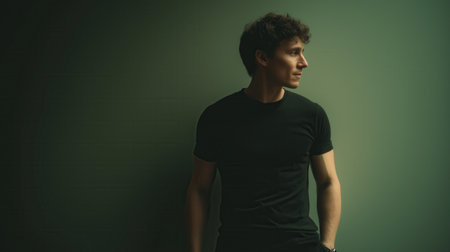 A man in with short brown hair wearing a fitted black t-shirt stands against a green wall, highlighted by strong sunlight and casting a distinct shadow.