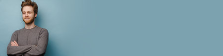 White ginger man smiling while posing with arms crossed isolated over blue background