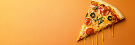 A vibrant pizza slice topped with pepperoni, olives, and herbs rests against a warm orange backdrop, highlighting cheesy drips and minimalist style.