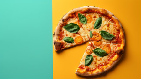 Vegetarian pizza with bright tomato slices and basil set on a gradient backdrop merging yellow into green, with space for messaging on the top and bottom.