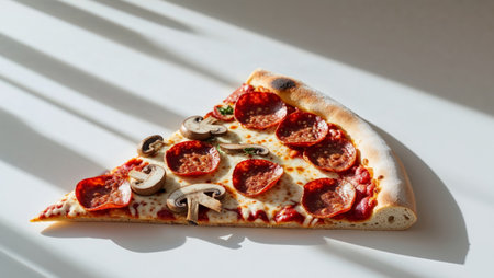AI Generated. A delicious slice of pizza with pepperoni and mushroom toppings