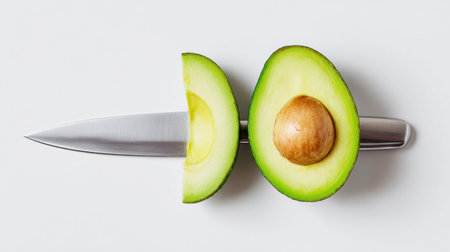 A visually appealing close-up of a freshly cut avocado halved, showcasing its creamy texture and seed, paired with a stainless steel knife against a clean white backdrop.
