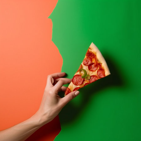 A hand holds a fresh, triangular pepperoni pizza slice, featuring melted mozzarella cheese, vibrant red sauce, and a miniature person on the golden crust.