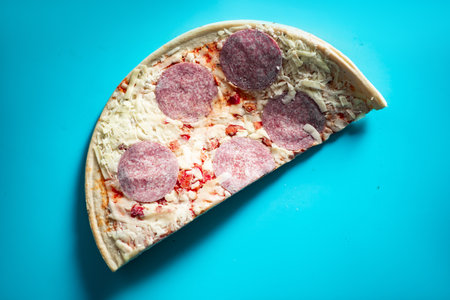 Top view with a single slice of pizza pepperoni on a green-mint colored background. Homemade delicious pizza with sausage, mozzarella and tomato sauce.