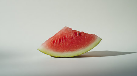 A single triangular watermelon slice with a bite taken out of it, placed on a pristine white background