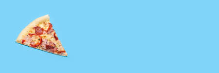 slice of hot fresh pizza lies on a blue background. Top view, flat lay. Banner.
