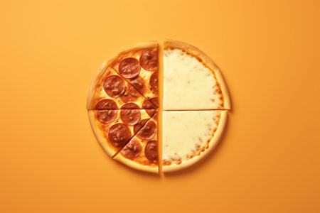 Different pizza on bright yellow or orange background. Closeup. Banner for design. Different pieces of pizza. Pizza with cheese and salami. AI generated.