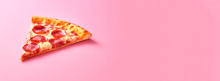 A delicious slice of pepperoni pizza placed on a pastel pink background with ample copy space, creating a fun and playful banner design. food, celebrations, fast food promotions, and social events.