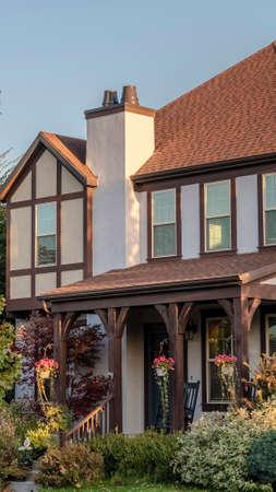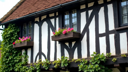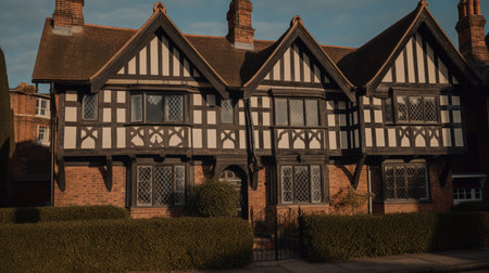 a front gable on a tudor-style village house basked in morning light, created with generative ai