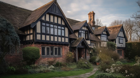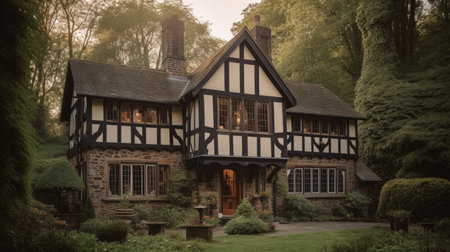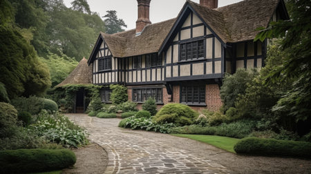 Distinctive Tudor house style. Retro garden. Generate Ai