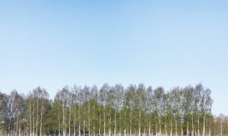 Banner of sky with early spring forest. Great background with copyspace. Nature landscape. Stock photo.