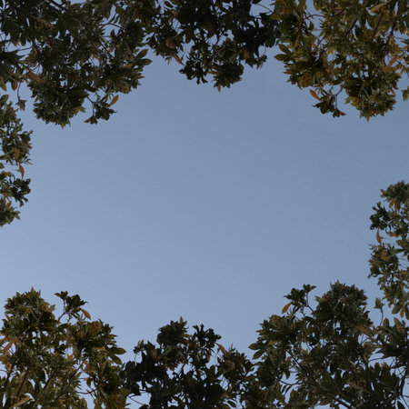 Branch trees against blue sky, bottom view. Natural green leave tree background with copy space with low angle view. Scene of fresh foliage and room for copy text, environment ecology concept