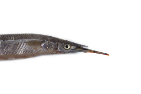 Garfish, sea needle (Belone belone) head with widely open jaws isolated on white background.
