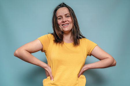 portrait of a young teenager with long wavy hair dressed in a yellow t-shirt, isolated on gray