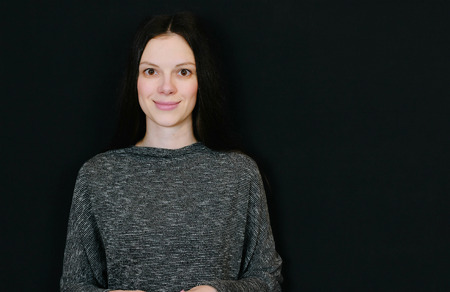 Studio shot of young beautiful woman in black top smiling and posing isolated on black background.