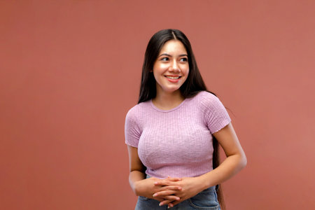 Portrait of a beautiful young asian woman smiling on pink background