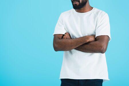 Cropped view of African American man in white t-shirt with crossed arms isolated on blue background