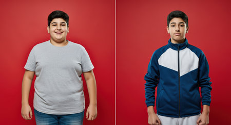 Transformation journey of hispanic male from young adult to fit and muscular man on red background