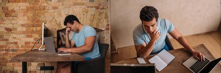 Collage of tired forex businessman with takeaway coffee using laptop near computers and smartphone in office, banner