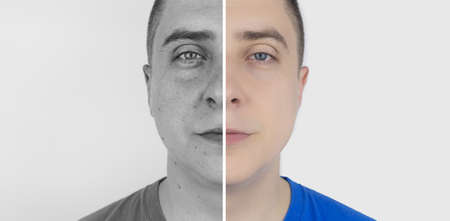 Contemporary artwork with portrait of happy man with effect of torn skin and insertion of part of face of plaster statue. Surrealism, torn personality concept