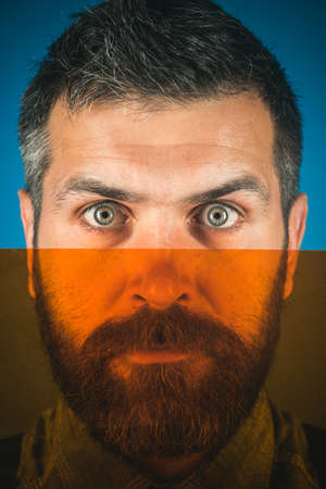 Color concept. Serious brutal caucasian hipster with beard and moustache, lower part of face is covered with colored glass. Closeup portrait bearded man behind colored glass.