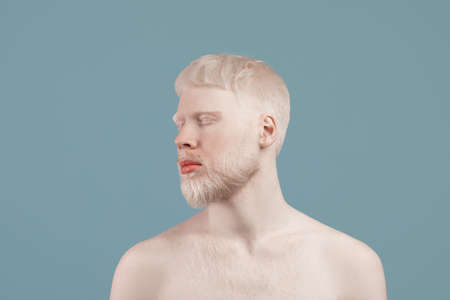 Uncommon appearance concept. Albino guy with naked shoulders posing over turquoise studio background