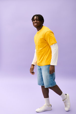 A young man confidently poses in a bright yellow shirt and stylish shorts, exuding positivity.