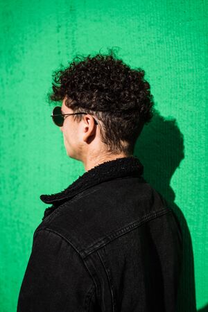 Portrait guy dressed modern in the street with sunglasses. Teenager Social Networking style photo