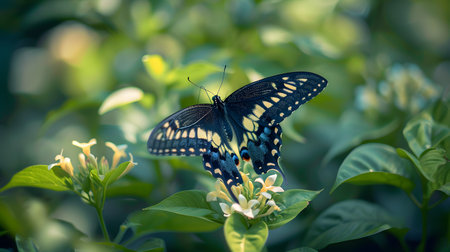 AI-generated A stunning blue morpho butterfly hovers amidst lush green foliage, its iridescent wings shimmering.