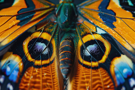 A Close up of the symmetrical patterns and vibrant colors on the wings of butterfly.