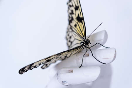 A delicate beautiful butterfly sits in the robots hand. The concept of the fragility of life