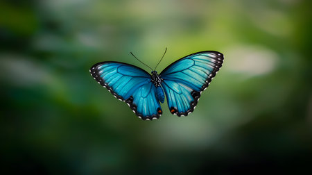 AI-generated A vibrant blue butterfly displays its intricate wing patterns against a soft, blurred green background.