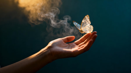 Butterfly in hand on a dark background with smoke. Copy space.