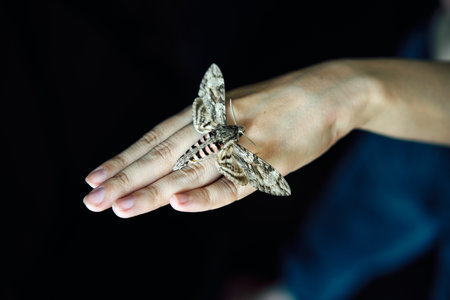 Butterfly hawk moth sitting on woman hand over dark background