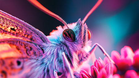 butterfly close-up on a pink flower in neon light