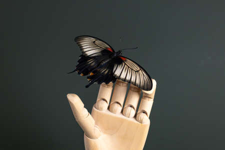 Butterfly papilio lowi still life concept on wooden hand on dark green background, human and wild life