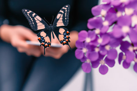 A colorful butterfly with a cell phone in a lush forest environment