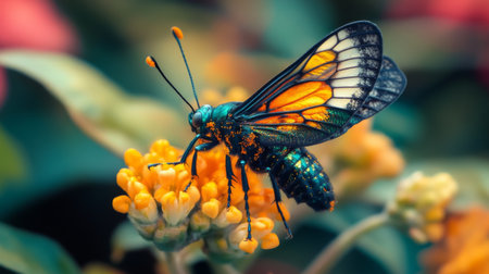 Macro shot of a colorful butterfly perched on a vibrant flower, with detailed wings in focus