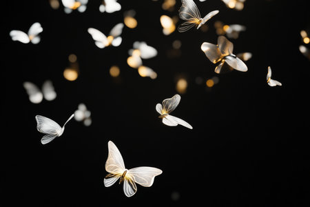 A 3D scene with floating digital butterflies made of light, gently fluttering against a dark black background, creating an elegant, almost magical atmosphere.
