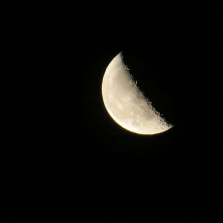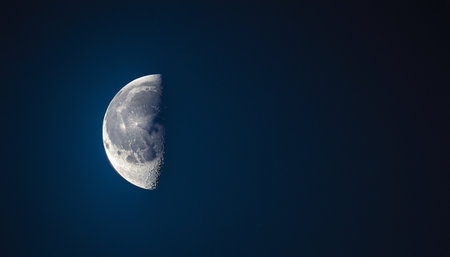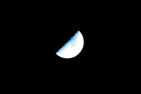 First quarter moon seen with an astronomical telescope, dark blue sky