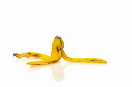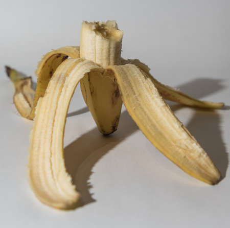 Hand holding a banana peel, a golden yellow fruit that has been eaten all the way, leaving only the peel. Shot in the studio on a white background with clipping paths and copy space isolated.