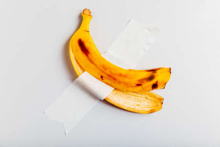 Yellow sweet banana on the wall. Banana duct taped to the white wall.