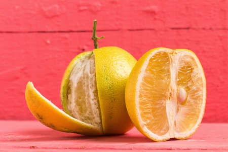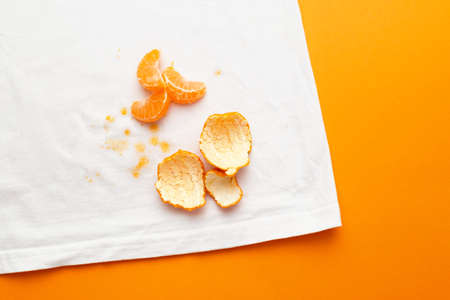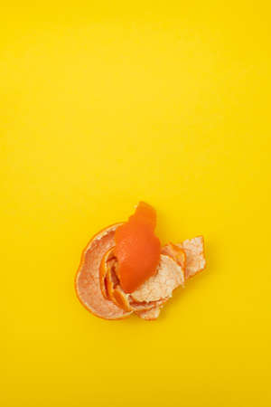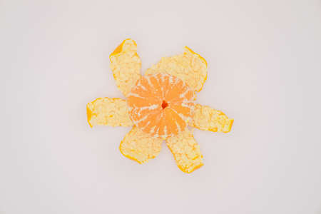 Single Mandarin close up isolated photo. Fresh peeling mandarin with its peel.