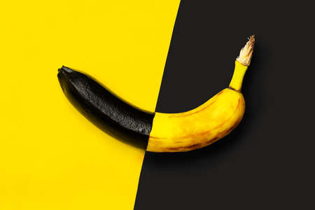 Contemporary art concept. Minimalistic poster design. Black banana. Yellow background. Contrast mix