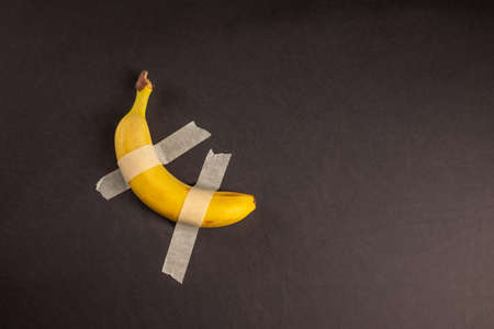 Yellow banana affixed to a concrete wall with a black duct-tape.