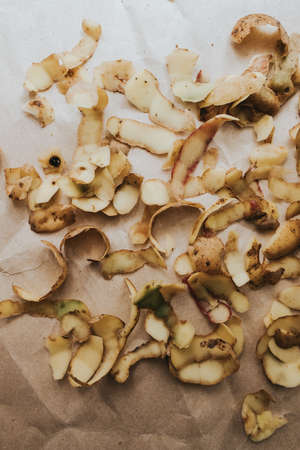 Kitchen waste flat lay of fruits and vegetables peels on a white background with copy space.