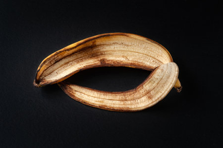 Banana skin on blue background. Using banana peel in compost or homemade fertilizer. Zero waste concept. Top view, copy space