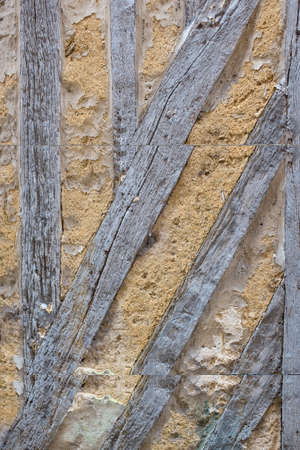 Detail of an old half-timbered house with dirty walls and weathered wood,damaged, bottom wall , abstact photo France, Normandy.