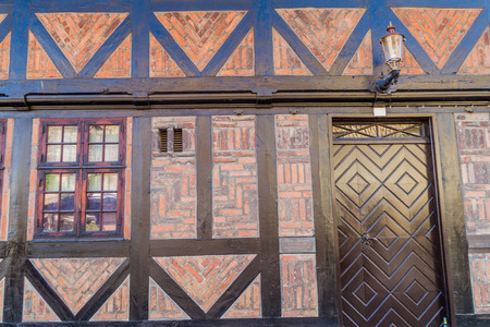 Half-timbered old house wall, brick wall pattern with timber framework. Detail from town of Halmstad in Sweden. Scandinavian style architecture background.