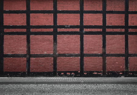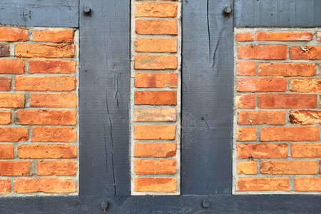 Fragment of prussian wall with red bricks and dark wooden wooden beams
